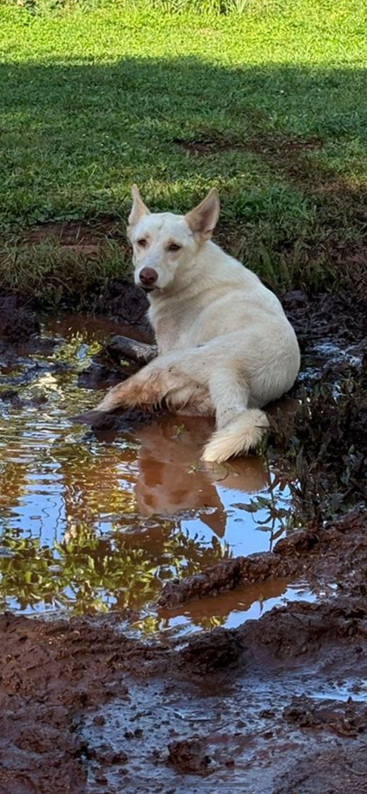 Maggie May is the gentlest of souls. She’s a little crybaby when things don’t go her way, loves rolling in sand and splashing in puddles, and prefers freedom to a dog house. When it rains, she hides in the cave—or behind the curtains if she’s inside.